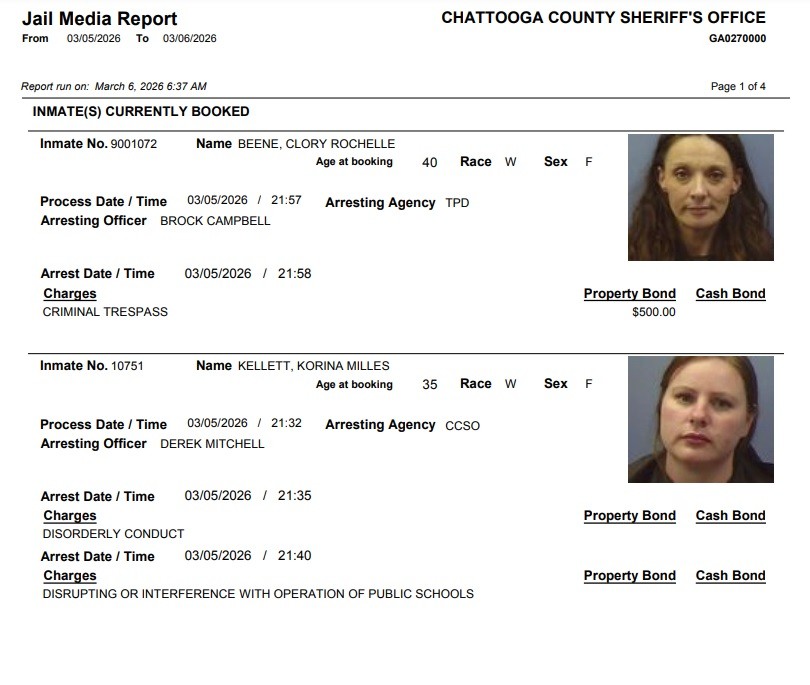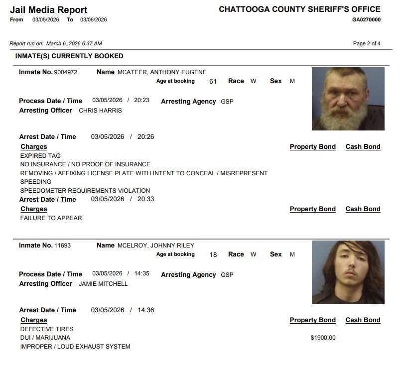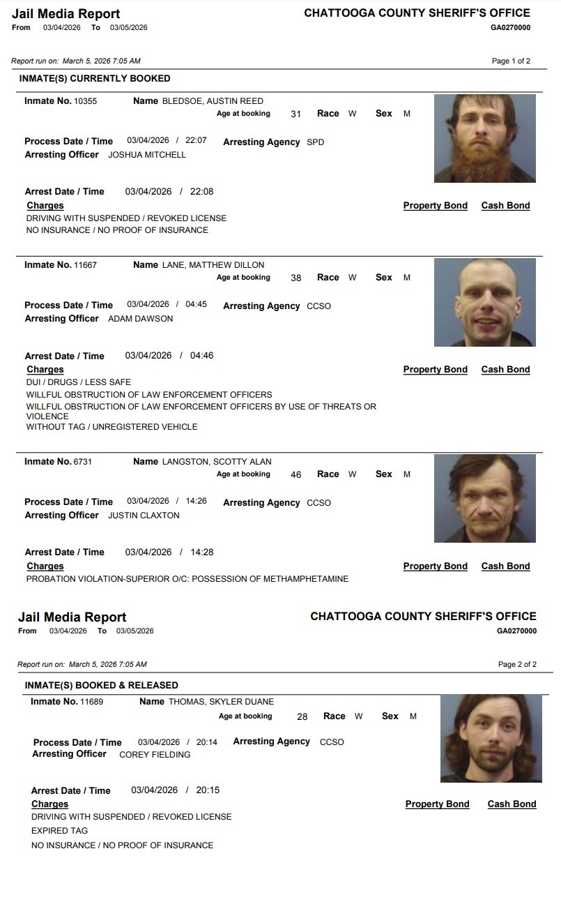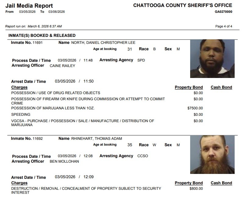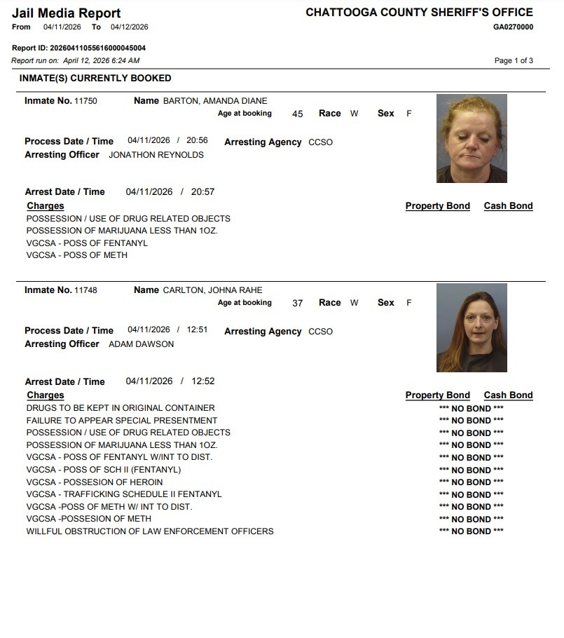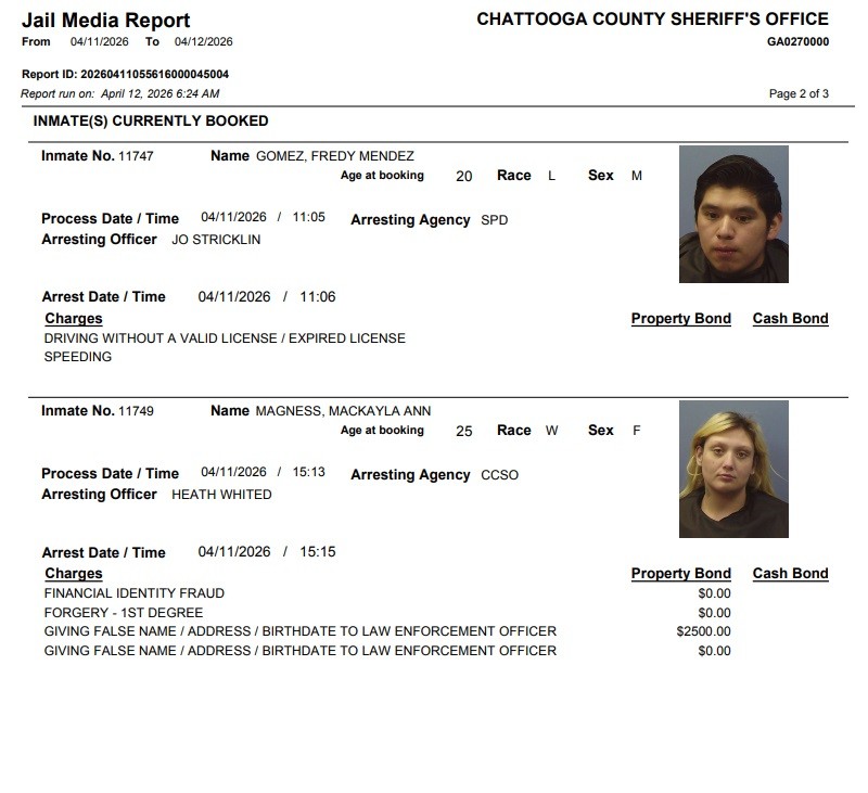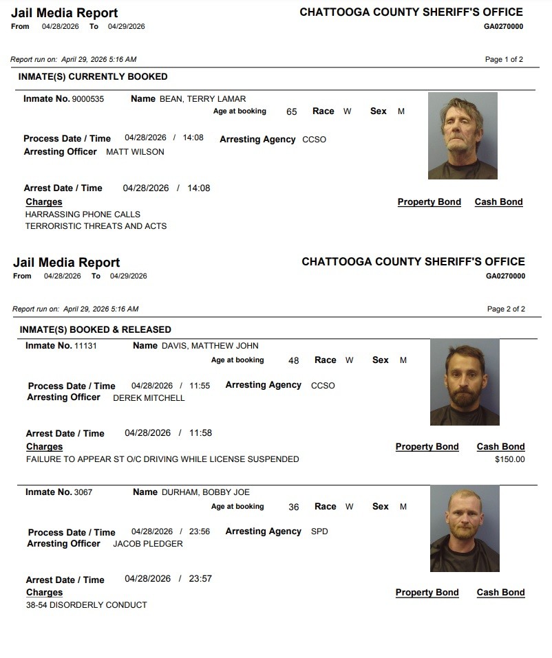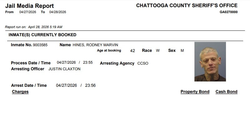 Here is the latest arrest report from the Chattooga County Sheriff’s Office for Thursday, April 16, 2026: