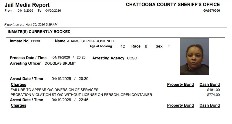 Here is the latest arrest report from the Chattooga County Sheriff’s Office for Monday, April 20, 2026: