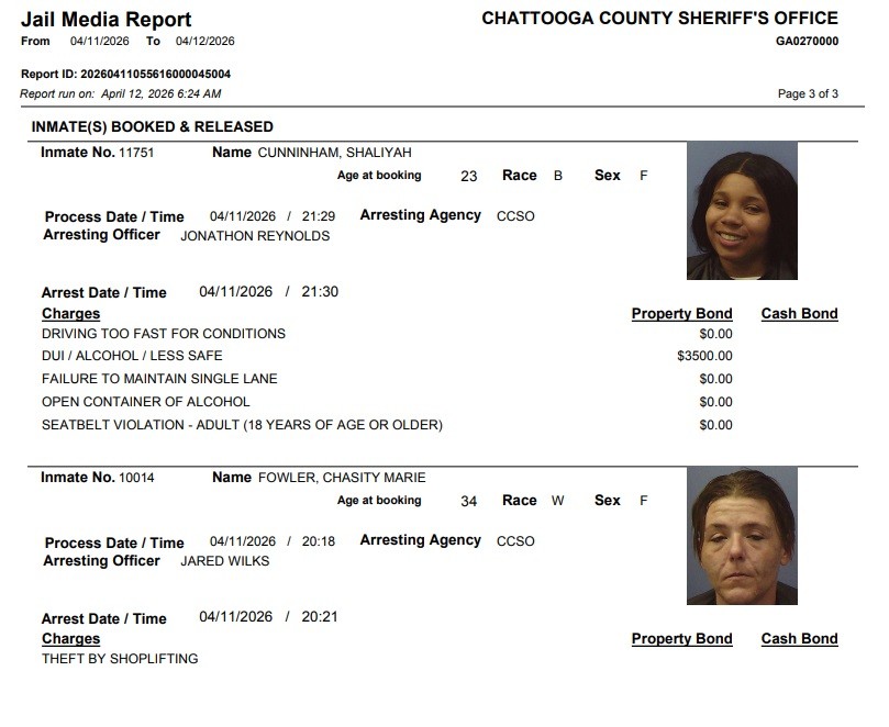 Here is the latest arrest report from the Chattooga County Sheriff’s Office for Wednesday, April 15, 2026: