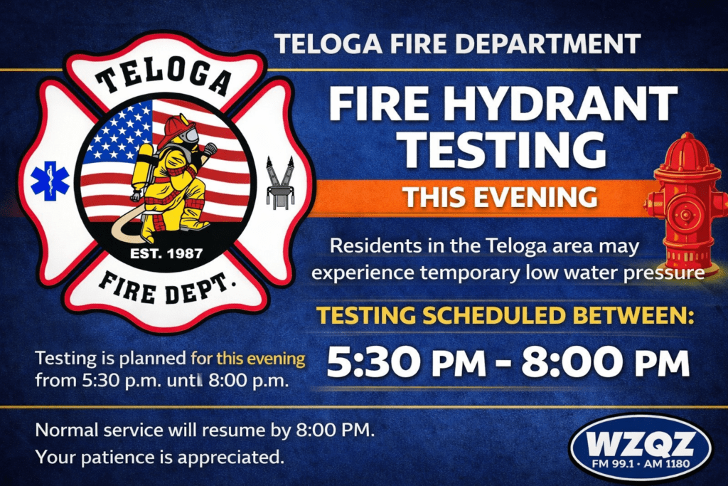 Residents in the Teloga area are being advised of possible temporary low water pressure this evening as the Teloga Volunteer Fire Department conducts scheduled fire hydrant testing.