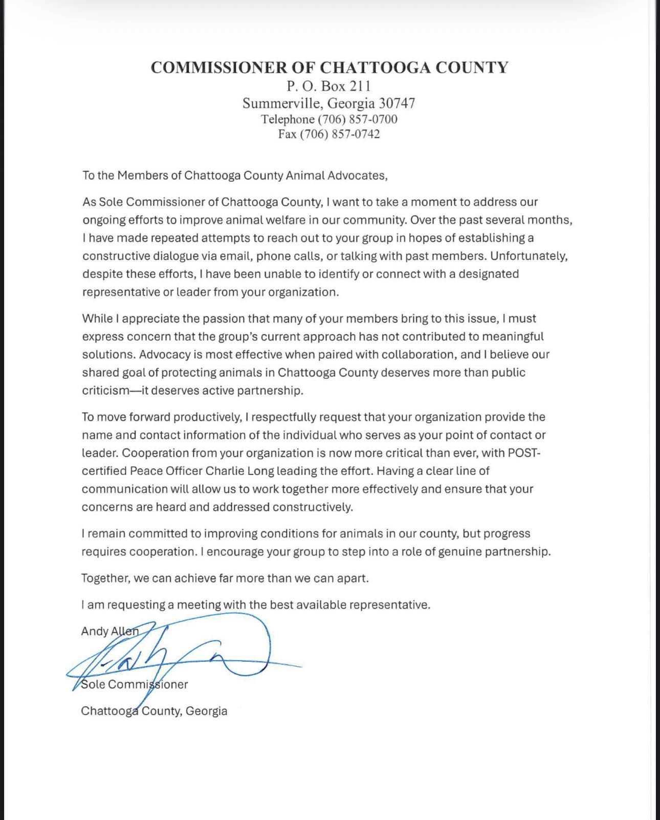 A continuing disagreement involving animal welfare efforts in Chattooga County is drawing renewed attention after Sole County Commissioner Andy Allen released a statement this week calling for clearer communication and a face-to-face meeting with the Animal Advocates of Chattooga County. The commissioner’s statement follows months of tension and includes earlier correspondence from this spring that centered on concerns about the county animal shelter and its leadership.