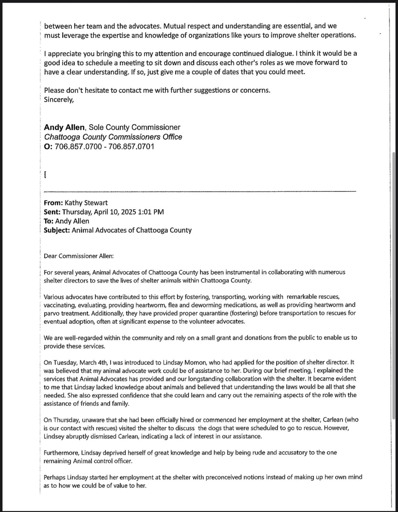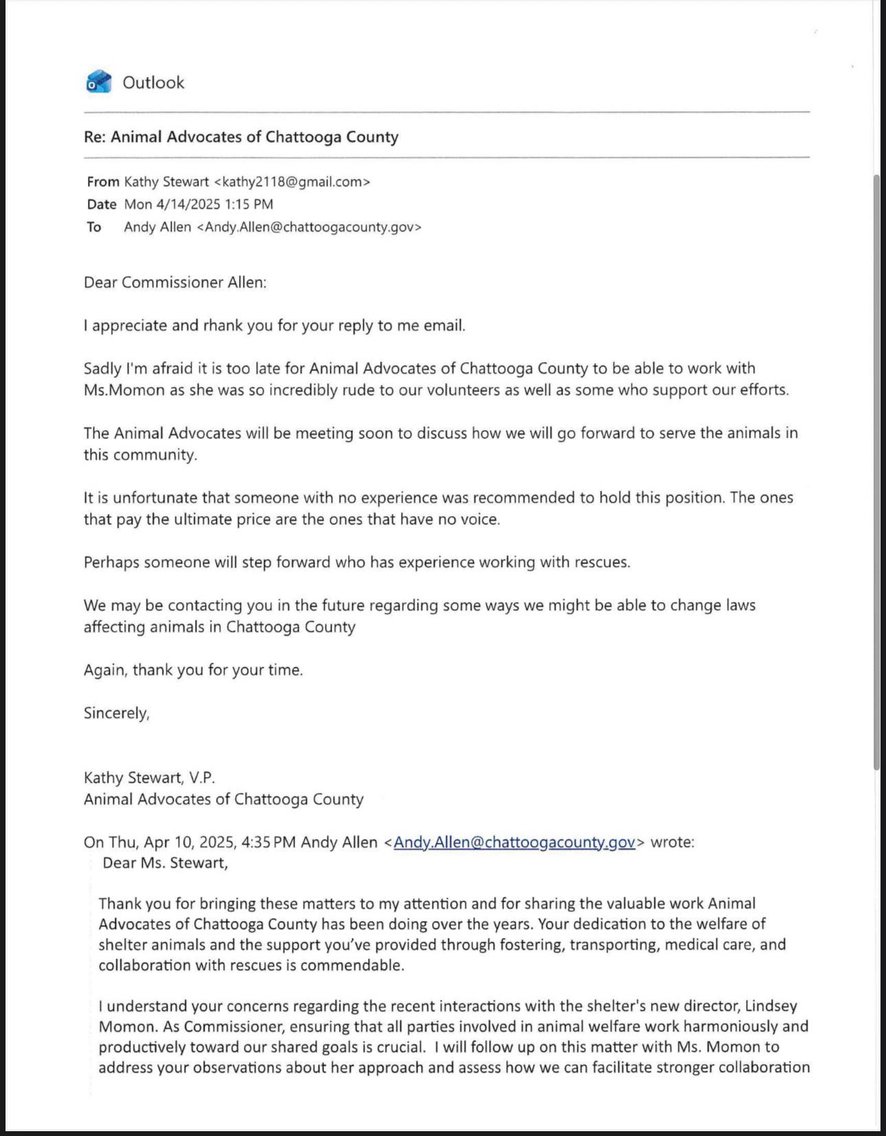 Four days later, on Monday, April 14, 2025, Stewart sent a follow-up message to Allen that took a sharper tone. She wrote that she appreciated his reply but stated the Animal Advocates felt it was “too late” for them to work with Momon, alleging Momon had been “incredibly rude” to volunteers and others who support the group’s efforts. Stewart wrote that the Animal Advocates would be meeting soon to discuss how they would move forward serving animals in the community. She also criticized the decision to place someone without experience in the position and said, in her view, the ones who ultimately pay the price are the animals. Stewart suggested that perhaps someone with rescue experience would step forward and added that the group might contact Allen later about possible changes to laws affecting animals in Chattooga County.
