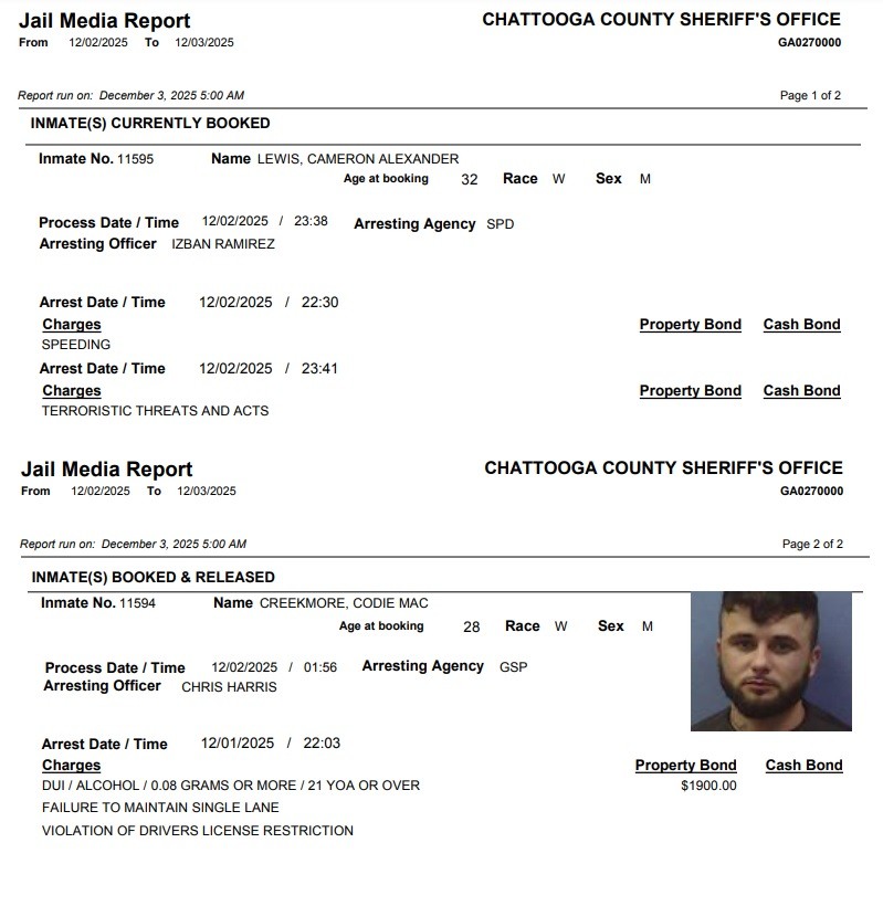 Here is the latest arrest report from the Chattooga County Sheriff’s Office for Wednesday, December 3, 2025: