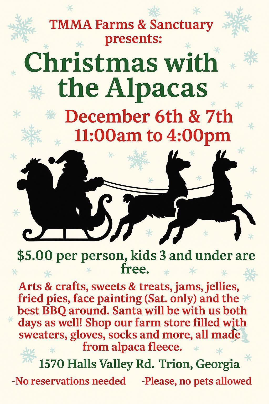 A unique holiday event is coming back to Chattooga County this weekend as TMMA Farms & Sanctuary hosts “Christmas with the Alpacas” this Saturday, Dec. 6, and Sunday, Dec. 7, in Trion.