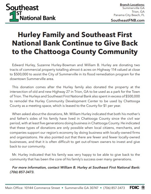 The release also notes additional community efforts tied to the Hurley family and the bank, including a previous property donation in Trion at the intersection of old and new Highway 27 planned for use as a park.