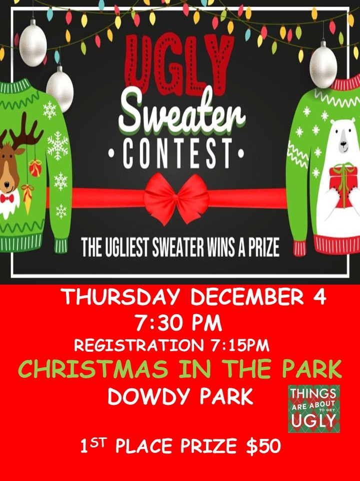 Adults and older participants will also have a chance to show off their holiday spirit during the Ugly Sweater Contest, scheduled for 7:30 p.m., with registration beginning at 7:15 p.m. The ugliest sweater will take home a prize, and event information lists a $50 first-place prize.