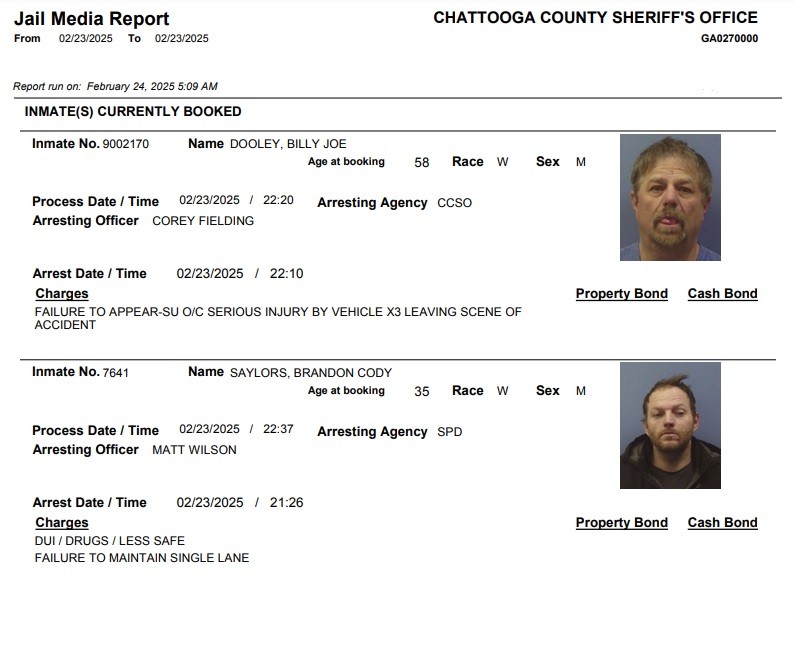 February 24, 2025 by WZQZ NEWS Local News, Local News Items 0 Here is the latest arrest report from the Chattooga County Sheriff’s Office for Monday, February 24, 2025: Facebook Twitter LinkedIn