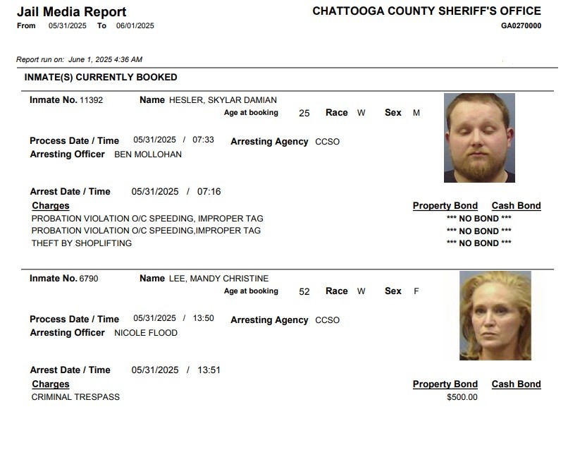 June 1, 2025 by WZQZ NEWS Local News, Local News Items 0 Here is the latest arrest report from the Chattooga County Sheriff’s Office for Sunday, June 1, 2025: Facebook Twitter LinkedIn