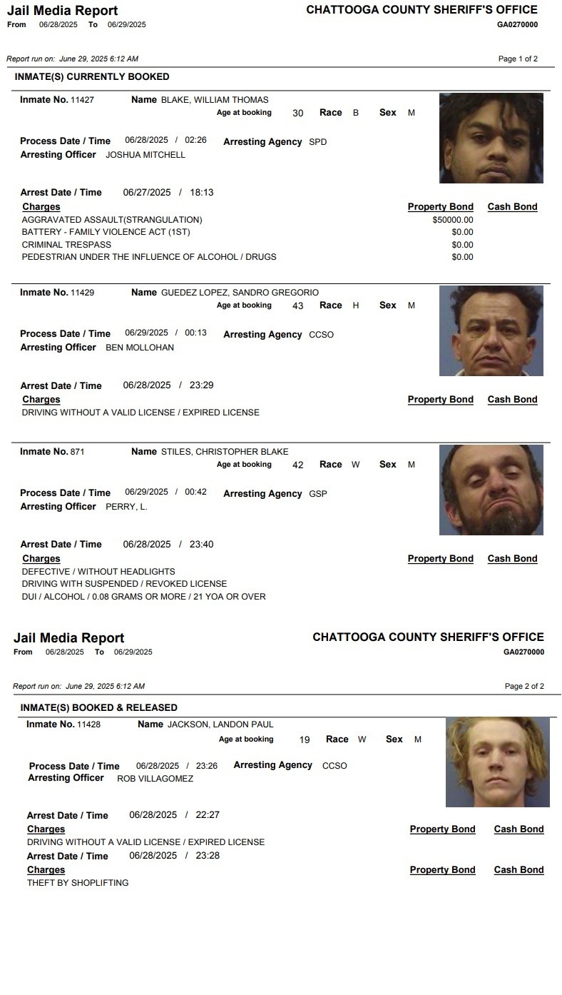 June 29, 2025 by WZQZ NEWS Local News, Local News Items 0 Here is the latest arrest report from the Chattooga County Sheriff’s Office for Sunday, June 29, 2025: Facebook Twitter LinkedIn