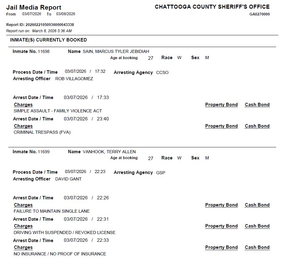 March 8, 2026 by WZQZ NEWS Local News, Local News Items #arrestreport, #CCSO, #chattoogacounty, #ChattoogaCountyGA, #ChattoogaCountyJail, #ChattoogaCountySheriffsOffice, #ChattoogaSheriff, #crimereport, #GeorgiaCrime, #JailReport, #LawEnforcement, #LocalArrests, #LocalNews, #lyerlyga, #MenloGA, #NorthGeorgiaCrime, #northwestgeorgia, #northwestgeorgianews, #PublicRecords, #SheriffsOffice, #summervillega, #trionga, #wzqznews 0