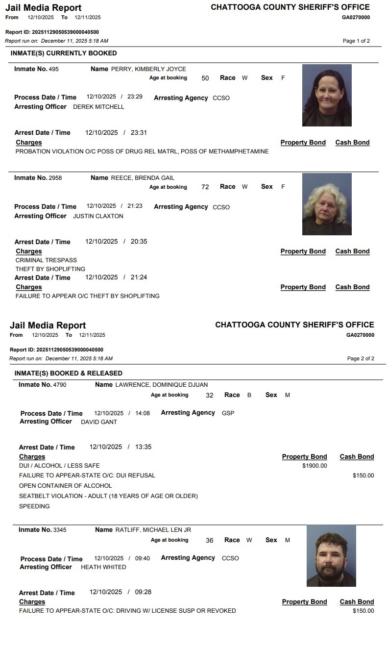 December 11, 2025 by WZQZ NEWS Local News, Local News Items #arrestreport, #BookingReport, #BreakingNews, #chattoogacounty, #chattoogacountysheriff, #ChattoogaSheriff, #CommunityUpdate, #CrimeWatch, #InmateReport, #JailReport, #LawEnforcement, #LocalNews, #lyerlyga, #MenloGA, #northwestgeorgia, #NWGA, #PublicSafety, #summervillega, #trionga, #WZQZ, #wzqznews 0