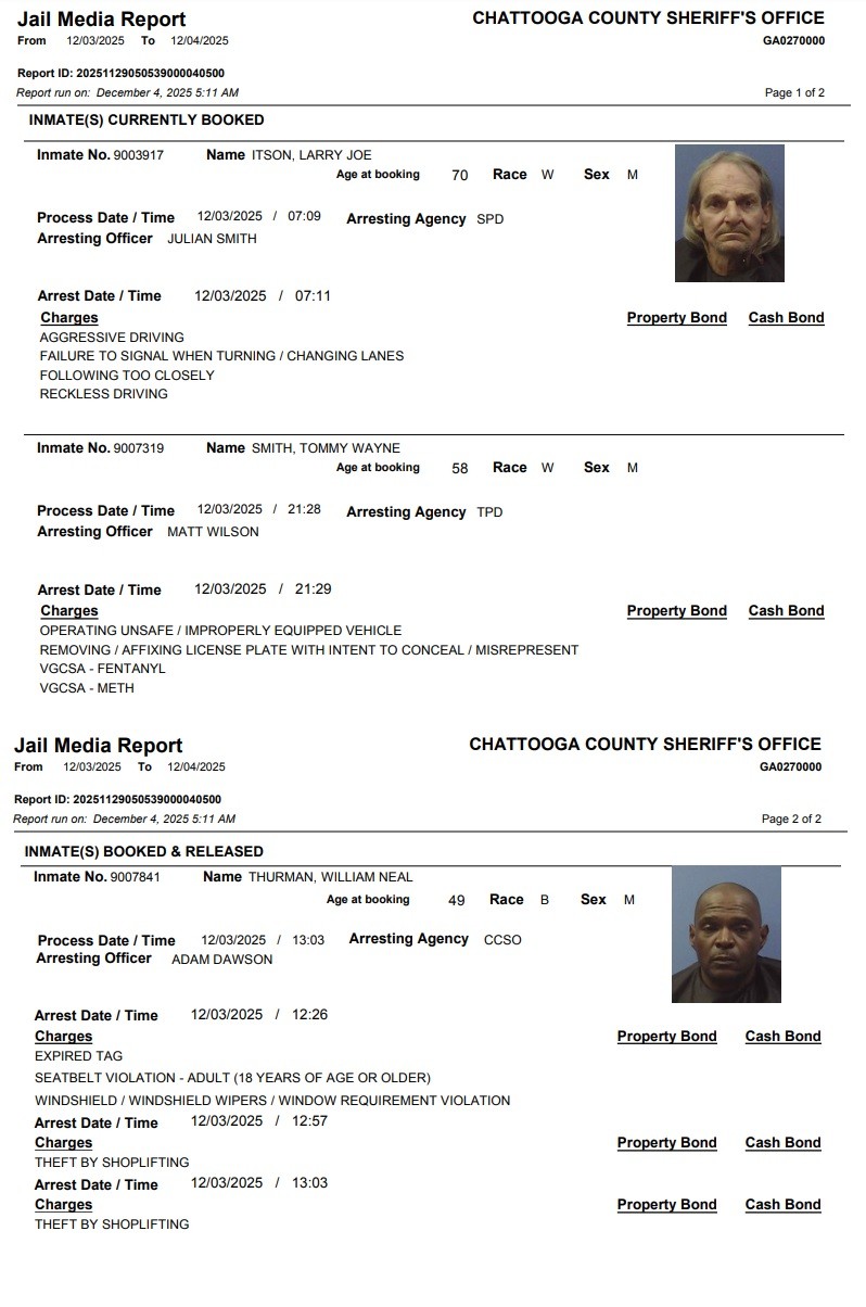 December 4, 2025 by WZQZ NEWS Local News, Local News Items #arrestreport, #BartowCounty, #BookingReport, #CatoosaCounty, #ChargesFiled, #chattoogacounty, #CourtNews, #CrimeNews, #FloydCounty, #Investigation, #JailLog, #LawEnforcement, #LocalNews, #northwestgeorgia, #NWGA, #PublicSafety, #RomeGA, #summervillega, #trionga, #WalkerCounty, #WhitfieldCounty, #WZQZ 0