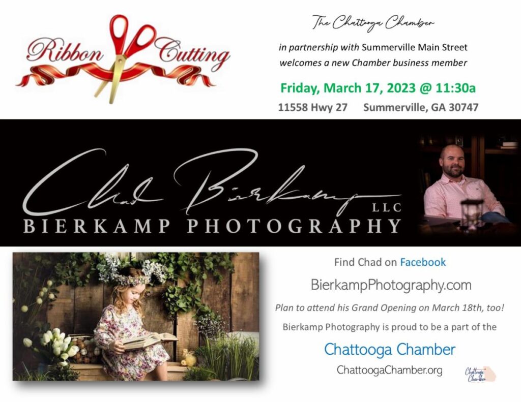 The Chattooga Chamber and Summerville Main Street invite the public to a ribbon cutting next Friday, March 17th at Bierkamp Photography, 11558 Highway 27 in Summerville. The ribbon cutting will be held at 11:30 AM. You can find out more about Bierkamp Photography on their Facebook Page. Bierkamp Photography will also be hosting a Grand Opening on Saturday March 18th.