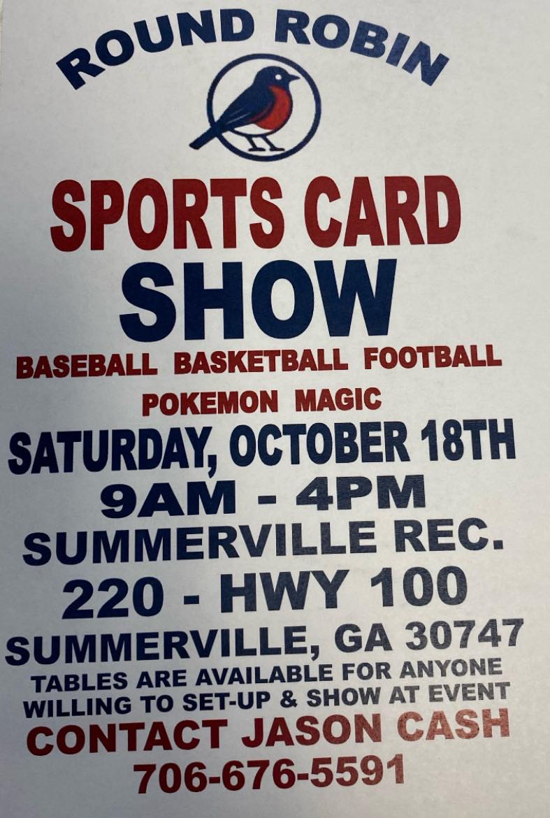 The Round Robin Sports Card Show will take place on Saturday, October 18th, at the Summerville Recreation Center. Running from 9 AM to 4 PM, the show will feature a variety of trading cards, including baseball, basketball, and football cards, as well as Pokémon and Magic: The Gathering cards. It’s a great opportunity for seasoned collectors to find missing items, newcomers to start their collections, and families to enjoy the hobby together. Additionally, the event invites participants to reserve tables to display, sell, or trade their own cards. Interested individuals can contact Jason Cash at 706-676-5591 for more information.