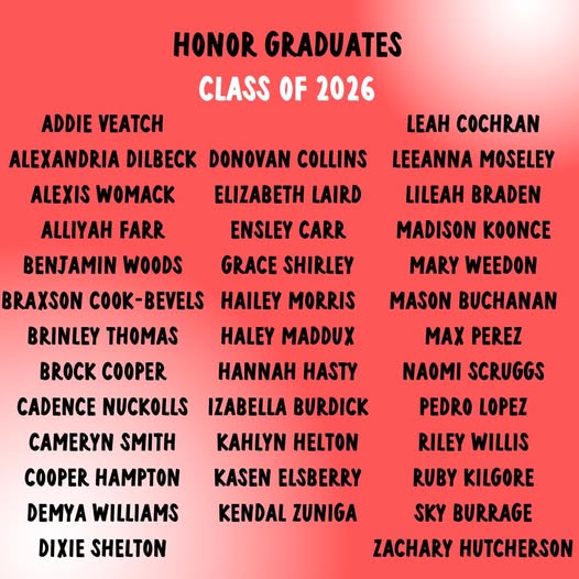 Those named as honor graduates include: Addie Veatch, Alexandria Dilbeck, Alexis Womack, Alliyah Farr, Benjamin Woods, Braxson Cook-Bevels, Brinley Thomas, Brock Cooper, Cadence Nuckolls, Cameryn Smith, Cooper Hampton, Demya Williams, Dixie Shelton, Donovan Collins, Elizabeth Laird, Ensley Carr, Grace Shirley, Hailey Morris, Haley Maddux, Hannah Hasty, Izabella Burdick, Kahlyn Helton, Kasen Elsberry, Kendal Zuniga, Leah Cochran, Leeanna Moseley, Lileah Braden, Madison Koonce, Mary Weedon, Mason Buchanan, Max Perez, Naomi Scruggs, Pedro Lopez, Riley Willis, Ruby Kilgore, Sky Burrage, and Zachary Hutcherson.