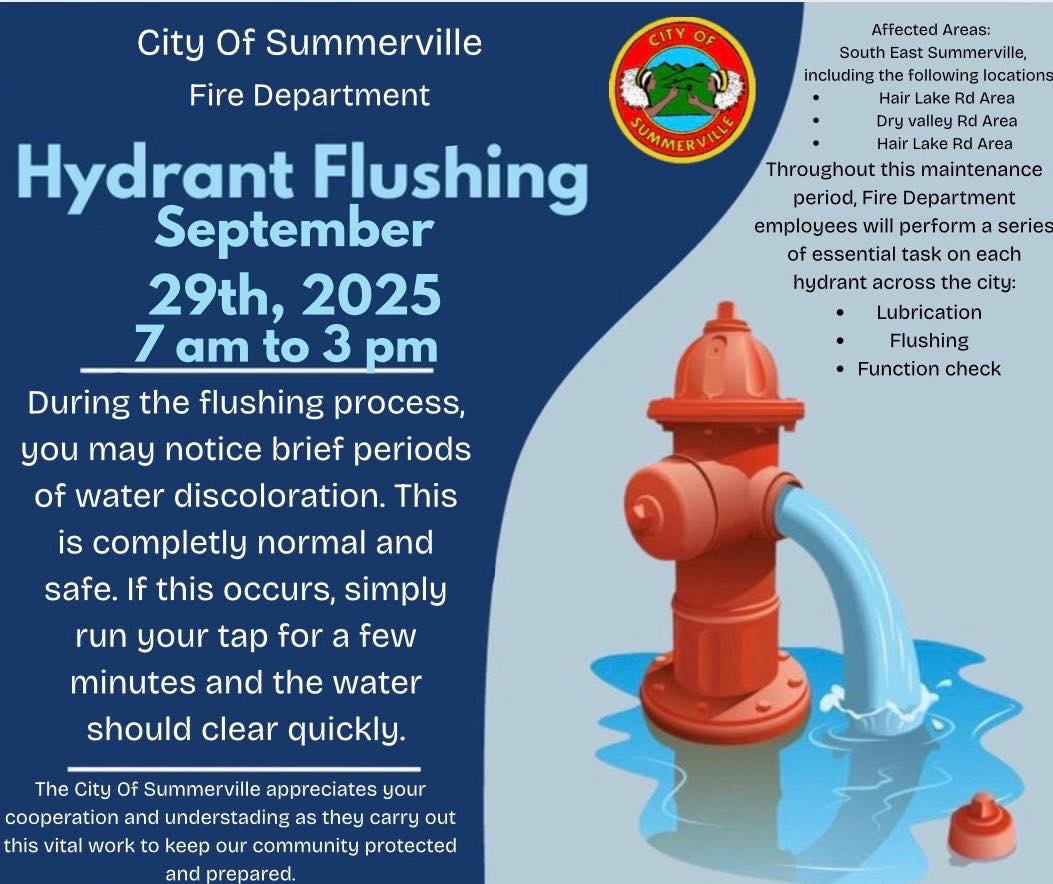 The City of Summerville Fire Department announced that it will conduct its routine hydrant flushing and maintenance program today, Monday, September 29th, 2025, from 7 a.m. to 3 p.m. This essential work is crucial for maintaining the functionality of the Summerville area fire hydrants, thereby ensuring community protection and preparedness. The scheduled maintenance will primarily affect residents in the Hair Lake Road Area and the Dry Valley Road Area.