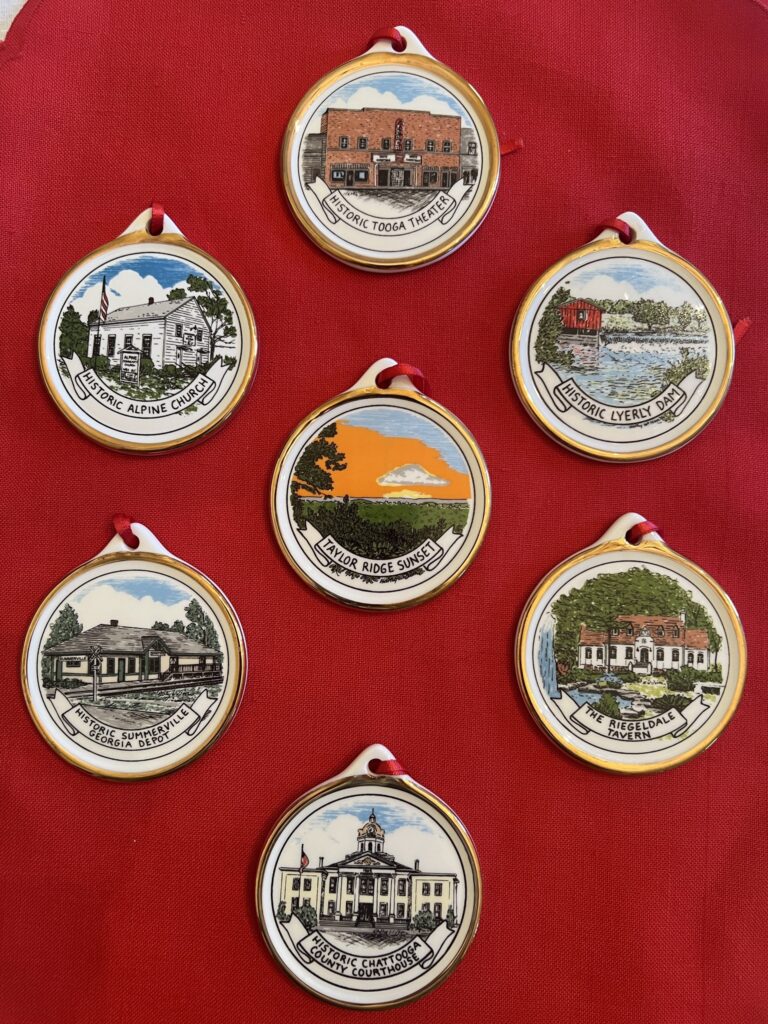 Each year the Chattooga County Historical Society offers a new Christmas Ornament featuring a different historical place in the county. In the past, the ornaments have featured the Chattooga County Courthouse, the Summerville Depot, Reigeldale Tavern, Alpine Church, the Tooga Theater and the Lyerly Dam. This year, the ornament is a picture of Taylor’s Ridge at Sunset. The ornaments are available on the Historical Society’s website for $20 ( Here). They can also be purchased at DIRT in Summerville for $15. All of the past ornaments are available as well. Put some Chattooga History on your Christmas tree ! They will become family heirlooms for your children and grandchildren!