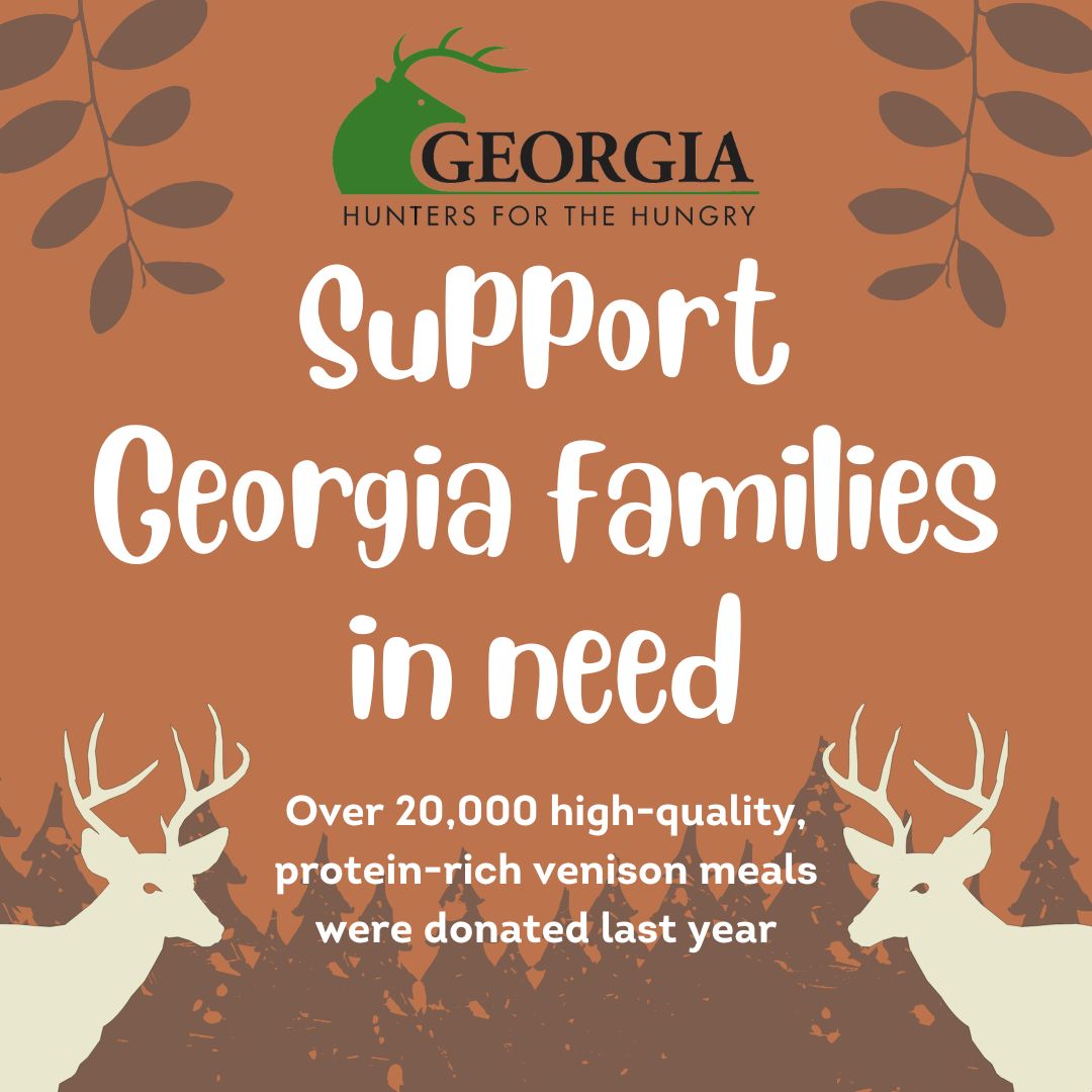 The Georgia Hunters for the Hungry (GHFTH) initiative offers hunters an excellent opportunity to contribute by providing venison, a highly nutritious, low-fat, organic meat source, to individuals in need. “There are still a few months remaining in the deer season; if your freezer is already full, you need not cease your hunting activities. We encourage you to consider harvesting a deer for the Hunters for the Hungry program! You can donate your deer at a participating processor at no expense to yourself.
