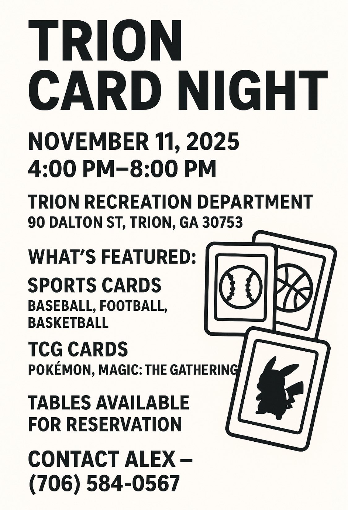 Get ready to shuffle your decks and examine your prized collections! The Trion Recreation Department will bring together collectors and enthusiasts of all ages for an evening of trading, showcasing, and camaraderie.