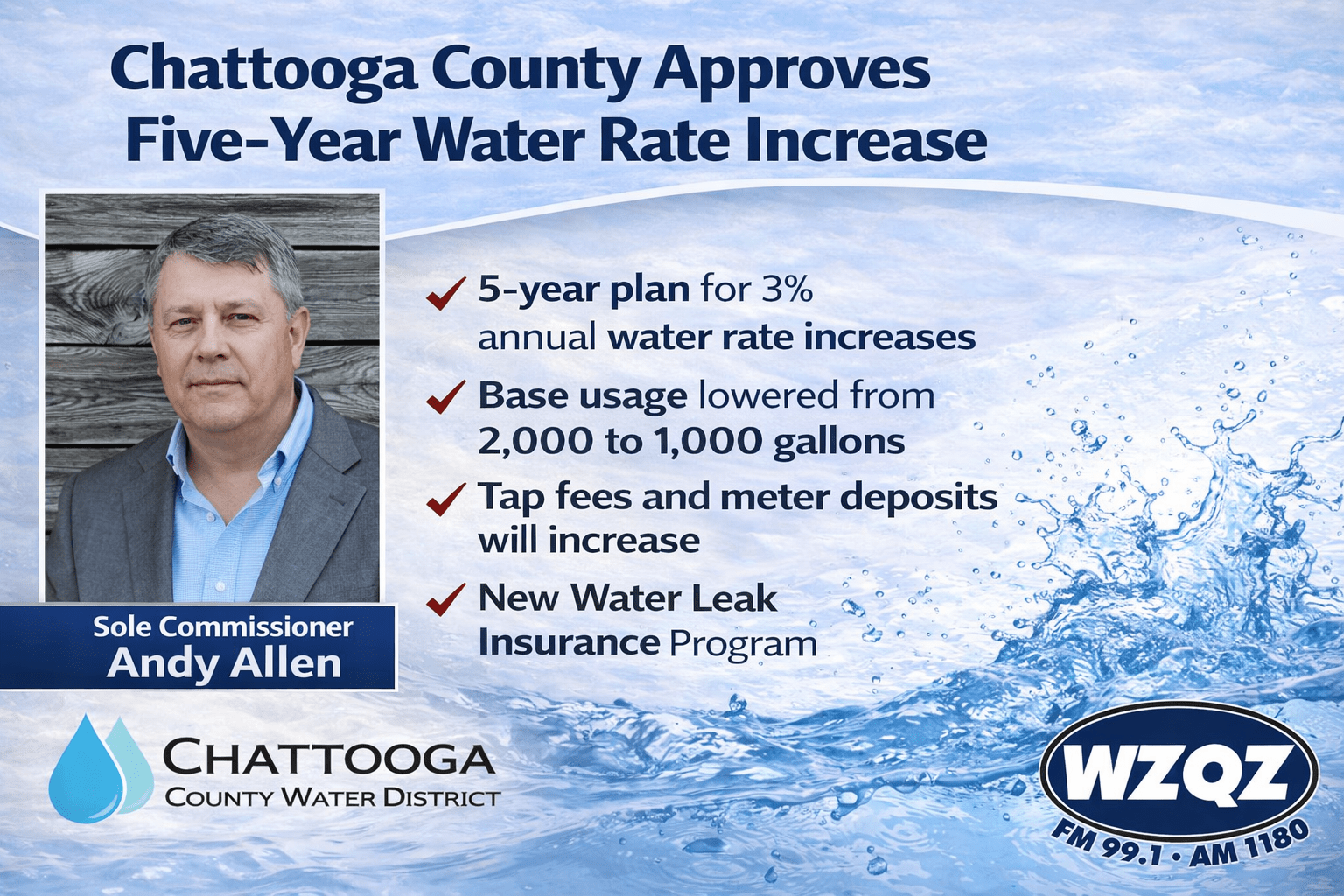 According to the newly approved resolution, water rates will increase by 3% each year as Sole Commissioner Andy Allen works to address rising operational costs, including materials, equipment, and overall system maintenance. Allen says the adjustment is necessary to ensure the long-term reliability and financial stability of the water system.