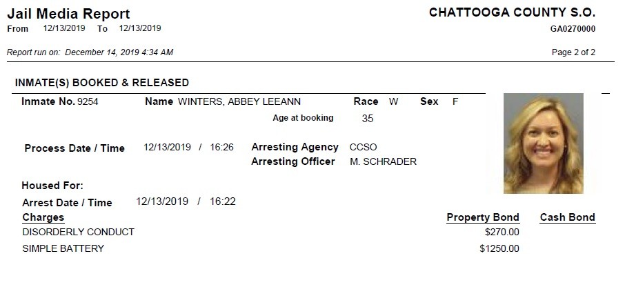 Mrs. Winters turned herself into authorities at the Chattooga County Jail on Friday afternoon and was booked at 4:22 PM.