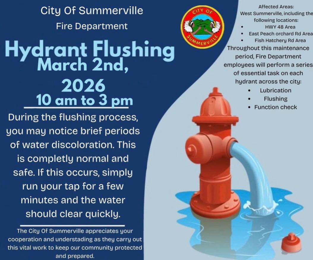 Hydrant flushing is set for Monday, March 2, 2026, from 10 a.m. until 3 p.m. The work will focus on West Summerville, including the Highway 48 area, East Peach Orchard Road area, and the Fish Hatchery Road area.