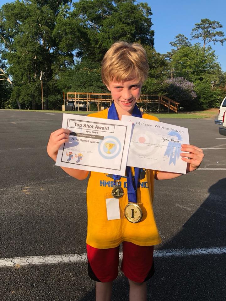 Tyler Floyd from Pack 38’s Webelos Den brought home medals for placing first in BB and Archery courses, and was also recognized for out shooting the range director.