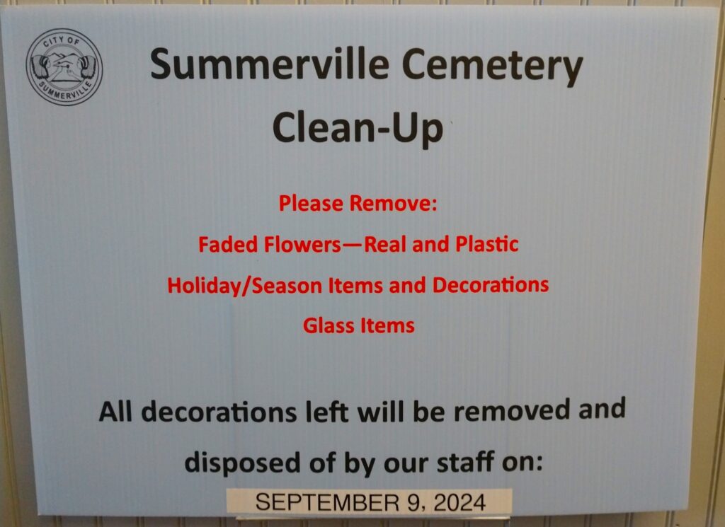 The City of Summerville has announced a clean-up at the Summerville Cemetery. From the City of Summerville: Please remove faded flowers, holidays (Spring/Summer, anything not current), and all glass items from sites at the Summerville Cemetery by September 8, 2024. Any of these remaining items will be removed and disposed of by our staff on September 9, 2024. Thanks for your help!