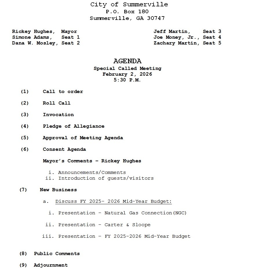 The Summerville City Council will meet in a Special Called Meeting this evening, Monday, February 2, 2026, beginning at 5:30 p.m. at Summerville City Hall. The agenda includes a discussion of the FY 2025–2026 Mid-Year Budget, including presentations from Natural Gas Connection (NGC), Carter & Sloope, and the FY 2025–2026 Mid-Year Budget presentation. The meeting will also include public comments before adjournment. You can see the complete agenda for tonight’s meeting below: