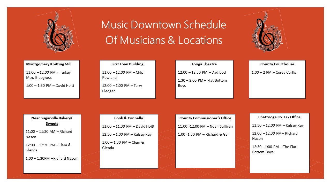 Summerville Main Street is proud to present “A Day of Music Downtown” on Saturday, August, 20. This event will highlight a variety of genres of music on the sidewalks of Downtown Summerville between the hours of 11:00 a.m. – 2:00 p.m. Locations to enjoy live music downtown on the sidewalks include: the Local Loans Building, the Chattooga County Commissioner’s Office, the Tooga Theatre, the Chattooga County Courthouse, the Montgomery Knitting Mill, beside Sugarville Bakery, the Chattooga County Tax Office, and beside The Market At DIRT.