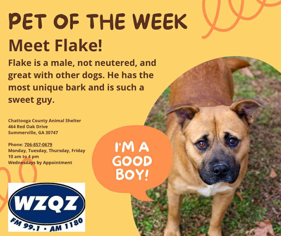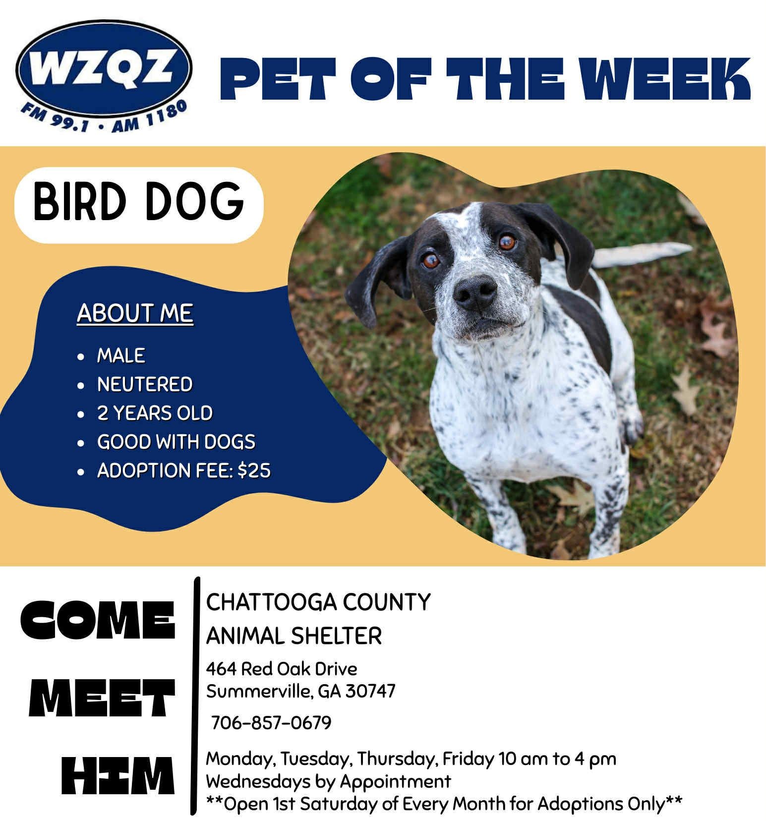 Each week, WZQZ will feature a pet from the Chattooga County Animal Shelter that needs a loving new home, and this week’s spotlight is on Bird Dog. Bird Dog is a 2-year-old male who is neutered, good with other dogs, and ready to meet his match.