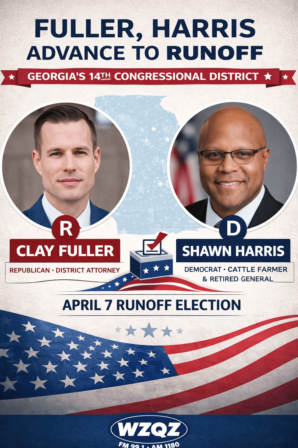 Republican Clay Fuller and Democrat Shawn Harris will face each other in an April 7 runoff election after no candidate received a majority in Tuesday’s special election to fill the remaining months of Marjorie Taylor Greene’s former U.S. House seat.
