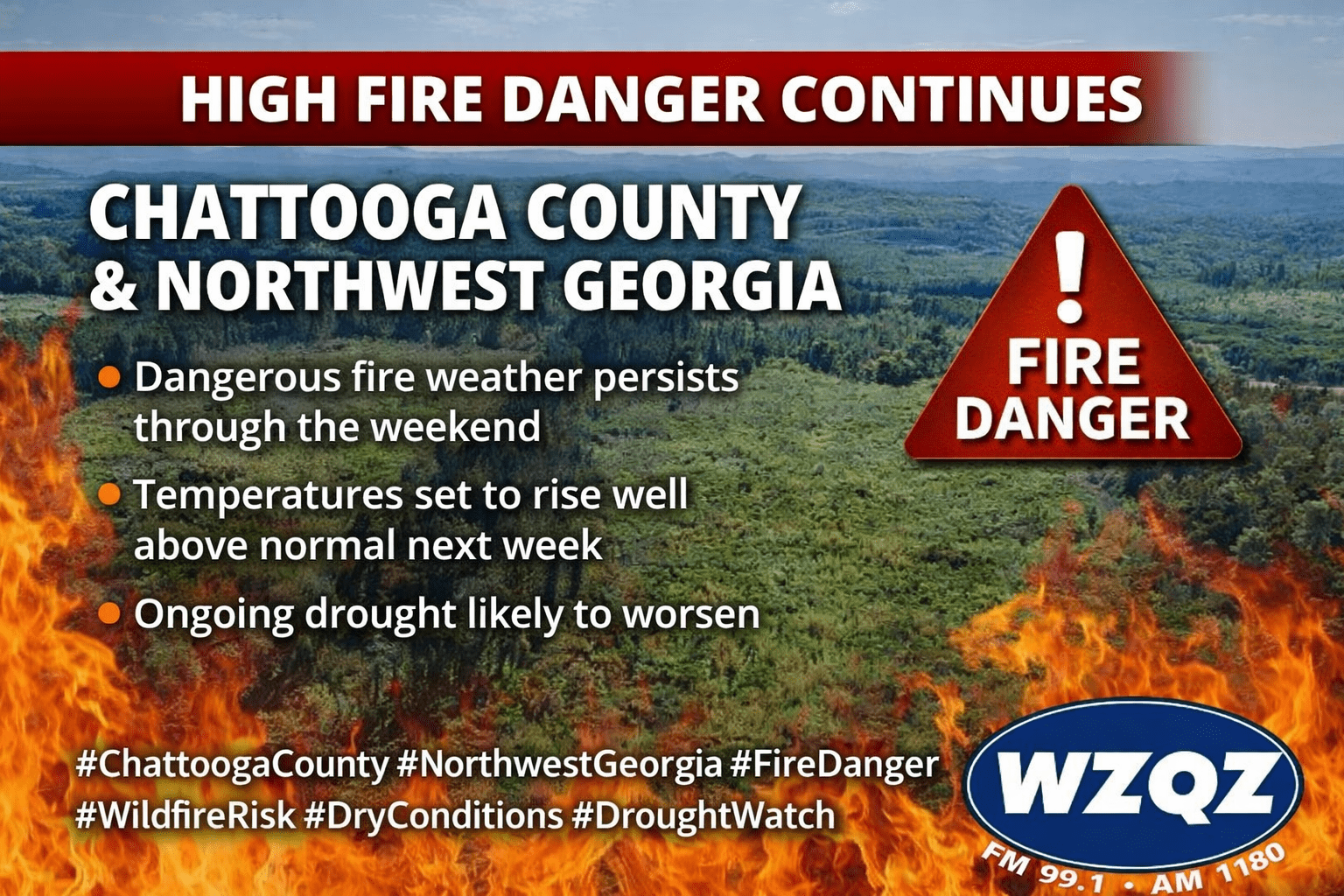 A Fire Danger Statement remains in effect across Chattooga County and much of Northwest Georgia as a prolonged stretch of hot, dry weather continues to elevate wildfire risks across the region. Emergency officials and forecasters warn that conditions are becoming increasingly favorable for fires to ignite and spread rapidly, especially during the afternoon and early evening hours when humidity levels drop the lowest.