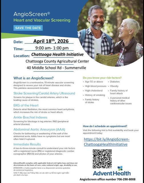 The Chattooga Health Fair is coming up, and this year it will include an AngioScreen bus offering important preventative screenings. The screening checks for early warning signs of heart attack and stroke before symptoms ever appear. That is what makes it so important. Many people feel completely normal and go about their daily lives with no idea that a serious health issue could already be developing.