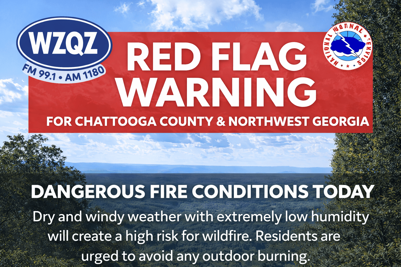 A Red Flag Warning has been issued for far north Georgia, including areas near Chattooga County, from noon through 8:00 p.m. Sunday. Officials say a combination of low humidity, dry vegetation, and breezy winds will create conditions where fires can start easily and spread quickly.