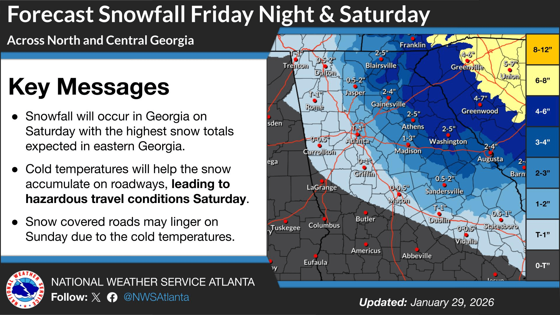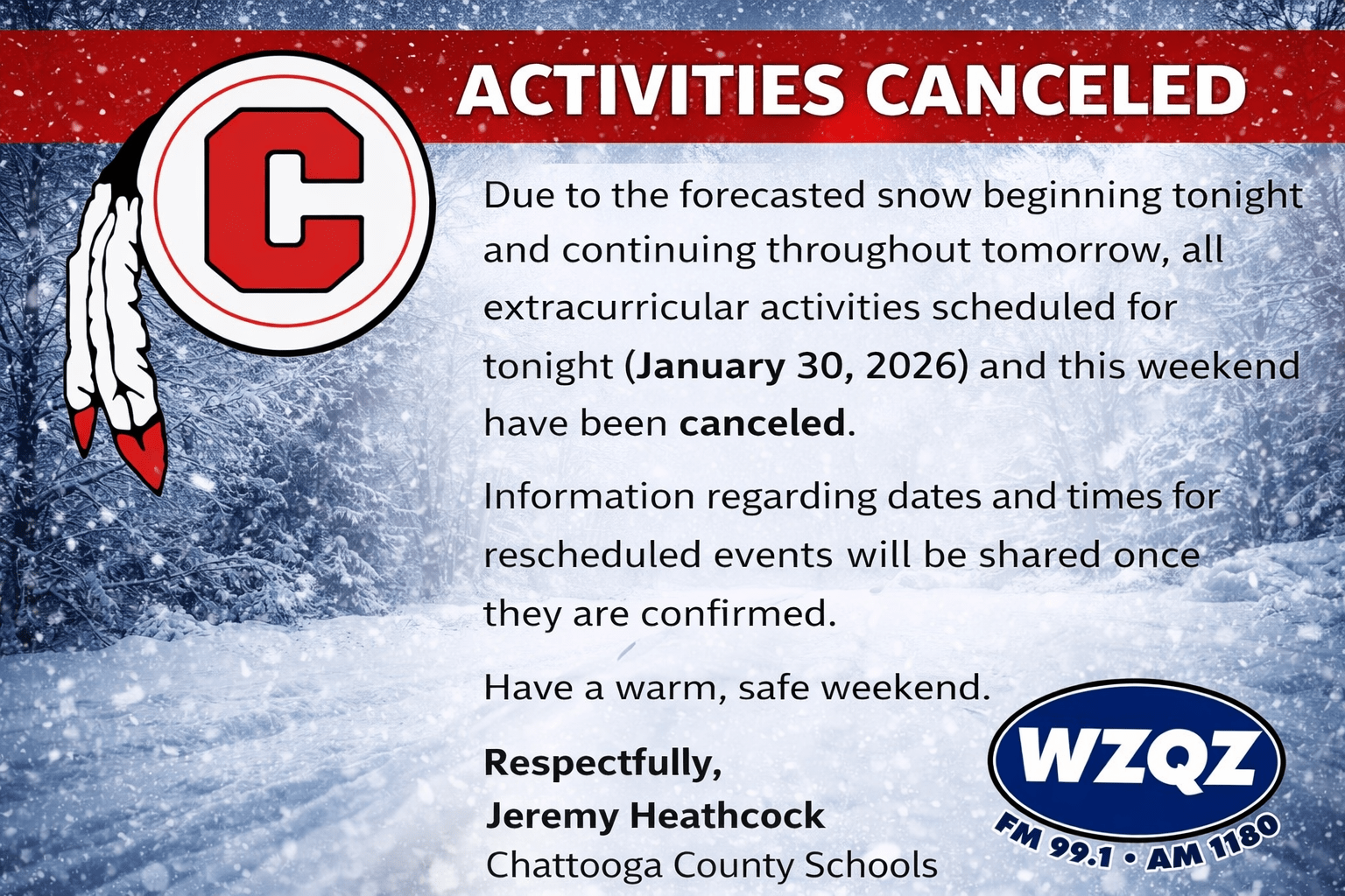 Chattooga County Schools have canceled all extracurricular activities scheduled for tonight, Friday, January 30, 2026, as well as events planned for this weekend, due to the forecast for snow beginning tonight and continuing into Saturday. School officials said information on rescheduled dates and times will be shared once details are confirmed.
