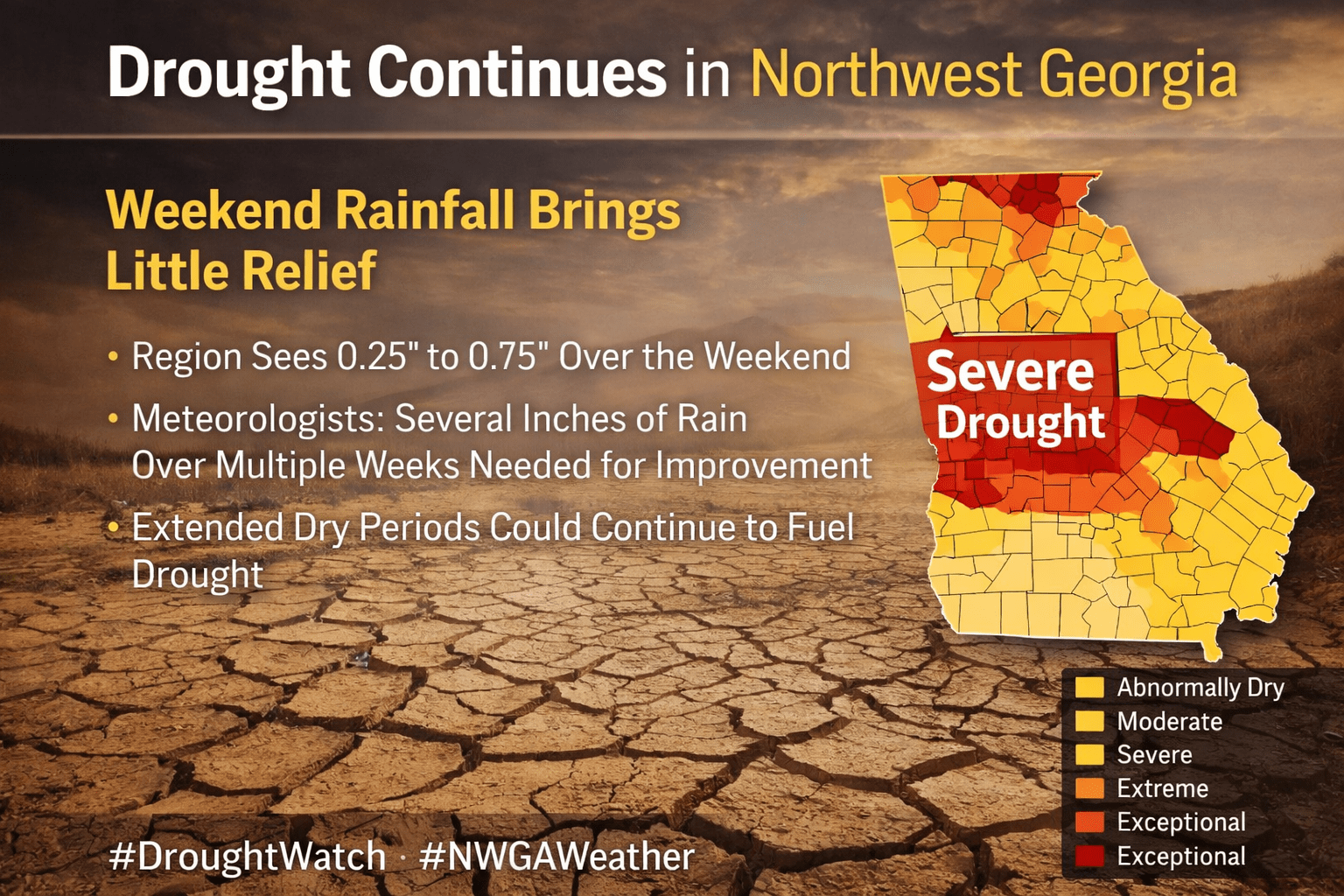 Drought conditions continue to grip Northwest Georgia, including Chattooga County, and this weekend’s round of showers and storms is expected to do little to improve the situation. While some areas picked up between a quarter and three-quarters of an inch of rain, experts say that amount is far below what’s needed to make a meaningful dent in the region’s rainfall deficit.