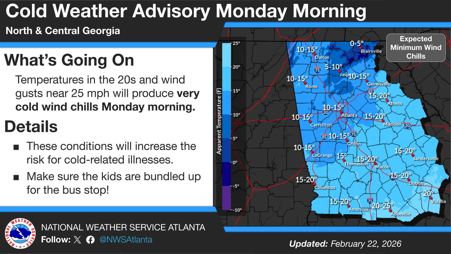 Residents across Chattooga County and Northwest Georgia are facing a double dose of winter weather as a Wind Advisory remains in effect until 7 p.m. Sunday, followed by a Cold Weather Advisory from 1 a.m. to 10 a.m. Monday.