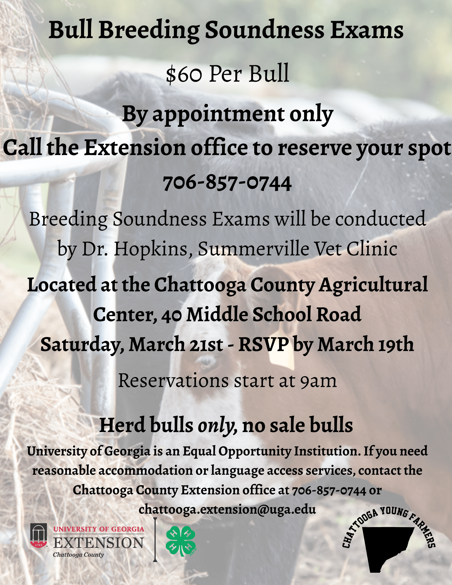 Cattle producers in Chattooga County and Northwest Georgia will have an opportunity to have herd bulls evaluated during upcoming Bull Breeding Soundness Exams scheduled for Saturday, March 21 at the Chattooga County Agricultural Center.