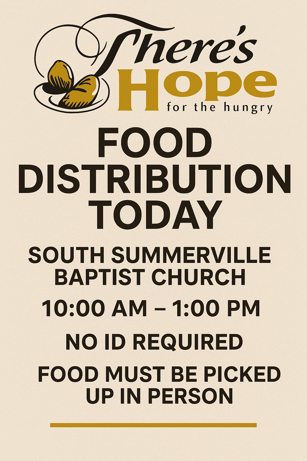 There’s Hope For The Hungry is hosting a food distribution event today at South Summerville Baptist Church. The organization will be on-site from 10 a.m. until 1 p.m., providing free food to anyone in need within the community.