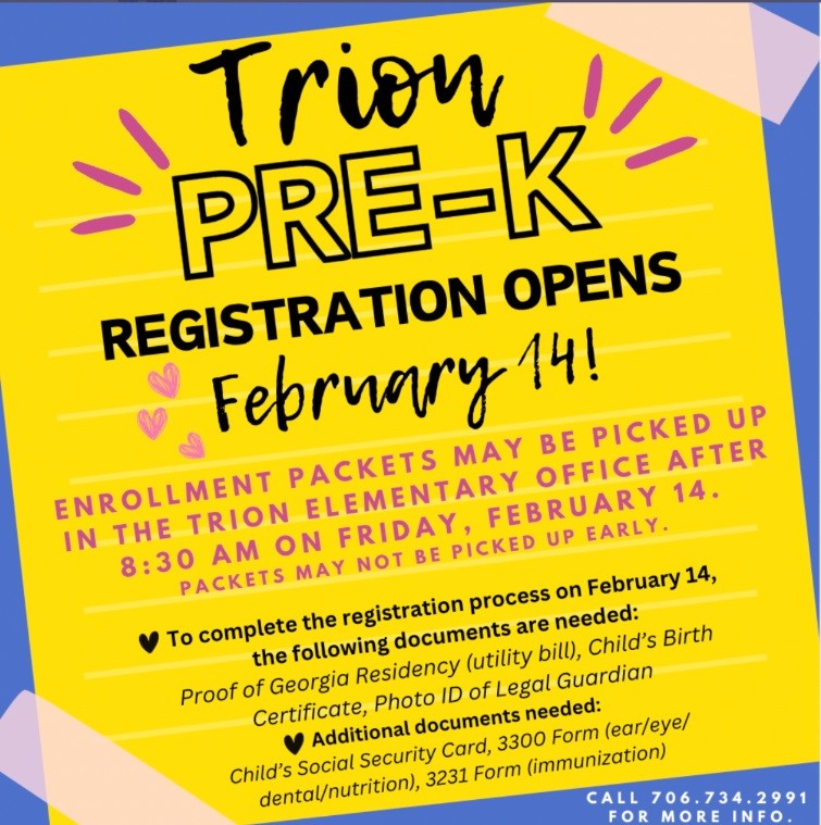 Families in the Trion community: registration for Trion Pre-K classes opens on February 14, 2025. Parents and guardians can pick up enrollment packets at the Trion Elementary office starting at 8:30 AM. Please note that packets will not be available for pickup prior to this time. To ensure a smooth registration process, families are reminded to bring several important documents on the registration day. Required items include proof of Georgia residency, such as a utility bill, the child’s birth certificate, and a photo ID of the legal guardian. Additionally, parents should prepare to provide a Social Security card for the child, the 3300 Form (which includes ear, eye, dental, and nutrition information), and the 3231 Form (which verifies immunizations). For those seeking more information about registration or the Pre-K program, please call the Trion Elementary office at 706-734-2991. Don’t miss this opportunity to secure a spot in the Trion Pre-K program and give your child a strong educational foundation